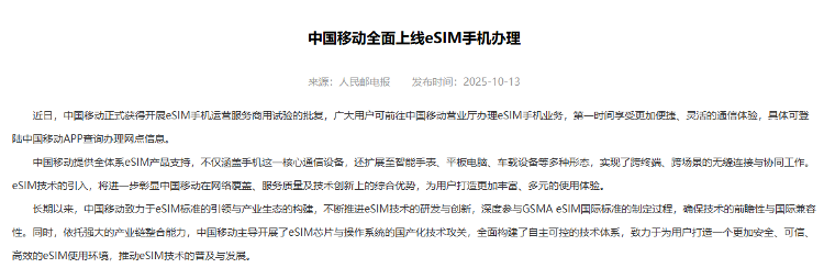 红星首都局10月23日报道称,iPhone Air将于10月22日正式上市。不过,有网友发帖表示,购买手机后,前往中国电信(601728.sh)营业厅申请ESIM服务,却因“年龄超过60岁”而被拒绝。对此,有媒体致电中国电信客服,客服解释称存在这一限制,但表示是因为目前系统正在升级维护:“ESIM业务正处于试运营阶段,从10月24日起将继续针对60岁以上人群。”红星首都局发现ESIM被称为嵌入式SIM(用户身份模块)或电子SIM卡。它直接嵌入设备芯片上的传统 SIM 卡中,无需将物理卡插入设备。消费者购买带有ESIM功能的手机后,可以将号码写入手机中”通过“无线下载”内置 ESIM 芯片,无需插入物理 SIM 卡。 ESIM手机和实体SIM卡手机的业务功能是相同的,都可以使用语音通信、上网、收发短信等通信服务。有消息称,苹果中国官网显示,10月22日,国行iPhone Air将正式上市。该机型通过ESIM激活,不支持实体SIM卡。中国移动(600941.sh)、中国电信和中国联通(600050.SH)均可为此型号提供ESIM支持。 10月13日,中国移动、中国联通发布文件称,已正式获准开展ESIM手机运营服务试商用。一天后,中国电信APP宣布已在全国31个省市开通ESIM服务。据了解,中国联通ESIM服务目前可以通过网上预订办理。中国移动表示,用户可以到中国移动营业厅申请ESIM手机服务。详情可登录中国移动APP查看该网点的办理信息。据中国移动官网中国电信APP提醒,申请条件包括:年满18周岁、名下电信卡数量少于5张、无未缴费及号码等。但该APP上并没有明确标注60岁的年龄限制。