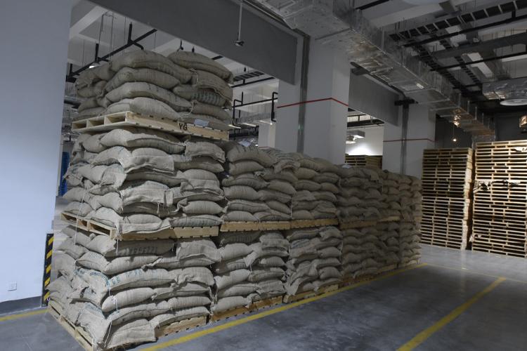 在大酒窖配送中心,来自埃塞俄比亚等30多个国家的生咖啡豆整齐堆放,享受着恒温恒湿的舒适环境。